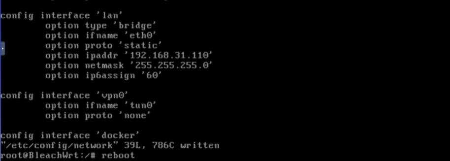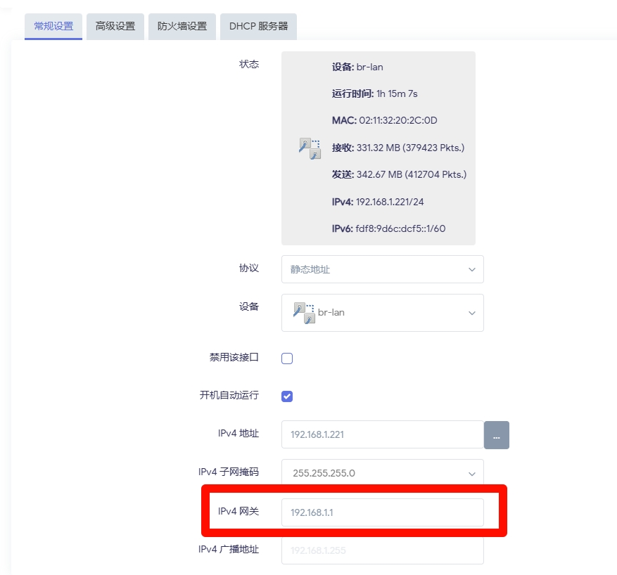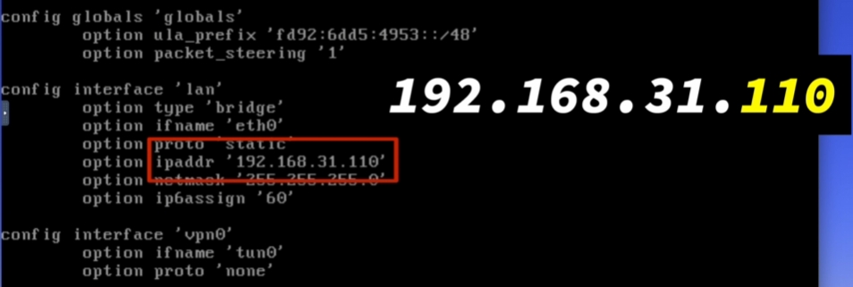 将lan配置设置中的ipaddr后的ip地址设置为与你路由器处于同一网段的其他ip地址,例如视频中的路由器网段为31,它可以设置为192.168.31.110,而我的网段为1,我设置成了192.168.1.221