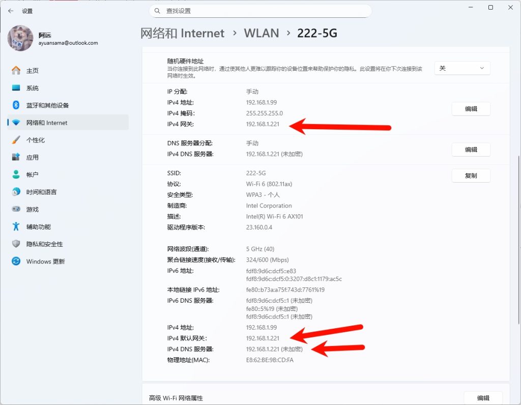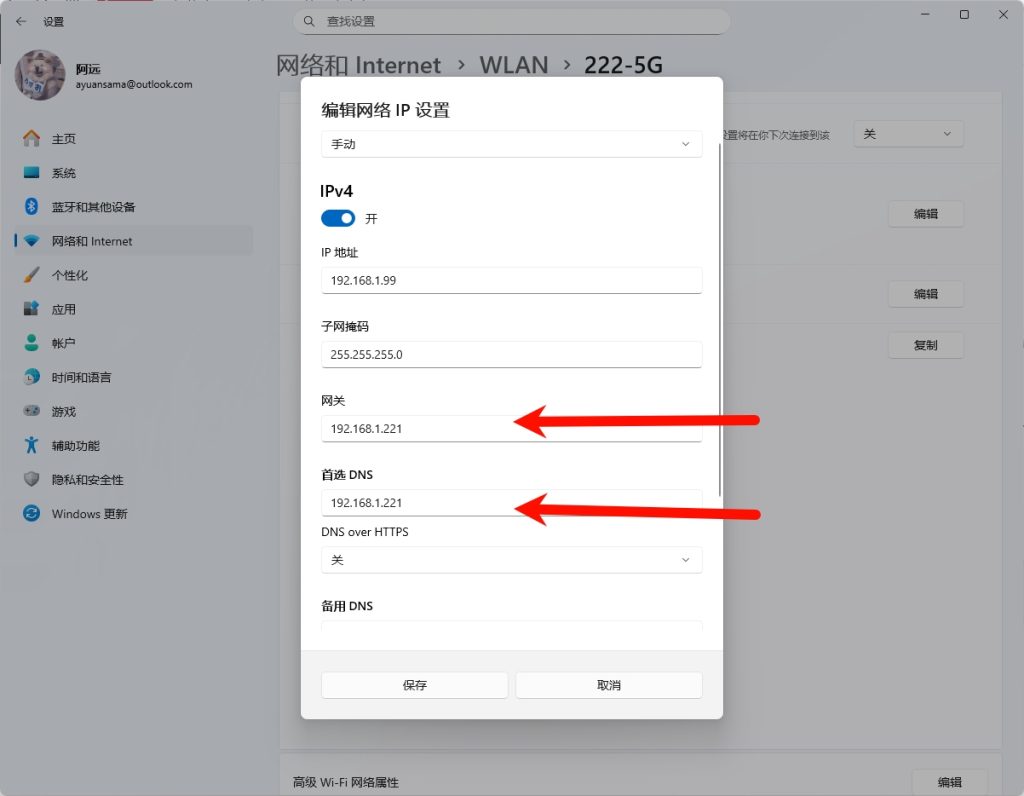 修改ipv4网关及dns服务器地址为你的无线路由器地址